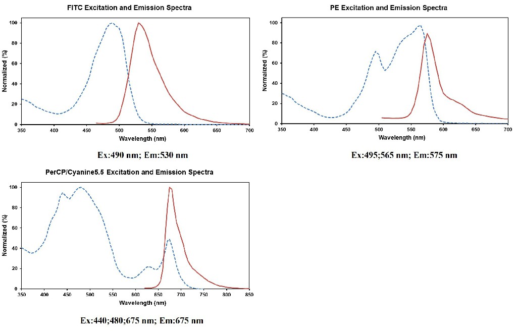 | Conjugation Information | FITC is designed to be excited by the Blue laser (488 nm) and detected using an optical filter centered near 530 nm (e.g., a 525/40 nm bandpass filter). PE is designed to be excited by the Blue (488 nm), Green (532 nm) and Yellow-Green (561 nm) lasers and detected using an optical filter centered near 575 nm (e.g., a 585/42 nm bandpass filter). PerCP/Cyanine5.5 is designed to be excited by the blue laser (488 nm) and detected using an optical filter centered near 675 nm (e.g., a 690/50 nm bandpass filter). |